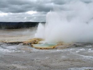 Rein bin ich allerdings erst, nachdem ich mich mit neuem Feuerholz, einer guten Karte mit allen Wanderwegen und einem Pfefferspray gegen Bären mit 10m Reichweite eingedeckt habe. Gleich nach dem Eingang, sah ich Bisons, die (wie einiges Getier in den USA) fast ausgerottet waren. Rund um die Bisons wuselten Wölfe, wie ich glaubte, im Laufe der Zeit habe ich dann herausgefunden, dass Bisons zur Nahrung von Wölfen gehören und da die Bisons total entspannt weiter grasten, während die „Wölfe“ um die Herde herumliefen, entschied ich mich dafür, dass die Wölfe wohl doch Kojoten sein müssten 😉
