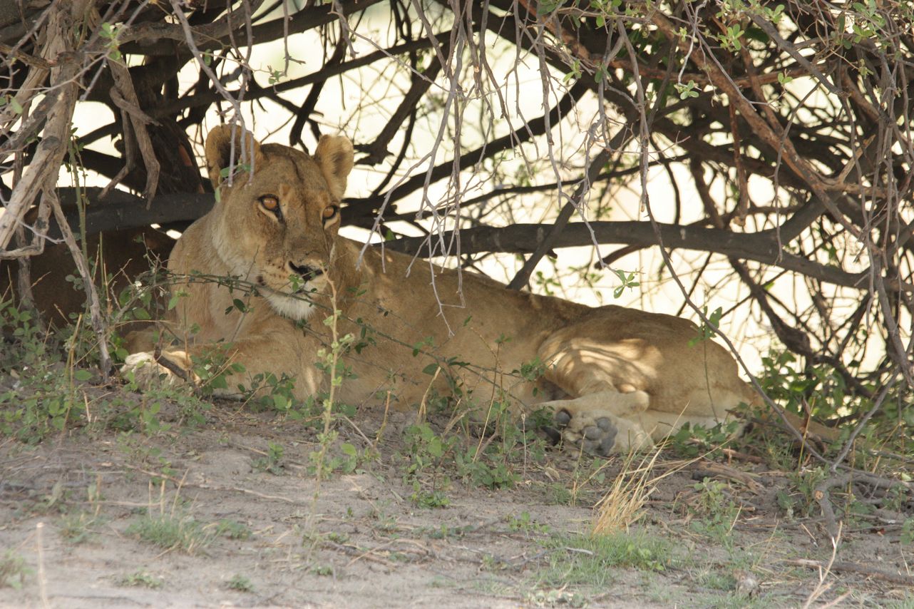 Now I am camping (illegally) at a waterhole in the middle of the Central Kalarahi. A giraffe drinks water from the waterhole and I can hear the lions roaring far away. There is a noise in the bush behind me, but I cannot find out what it is. Maybe another python, like the one I saw yesterday?