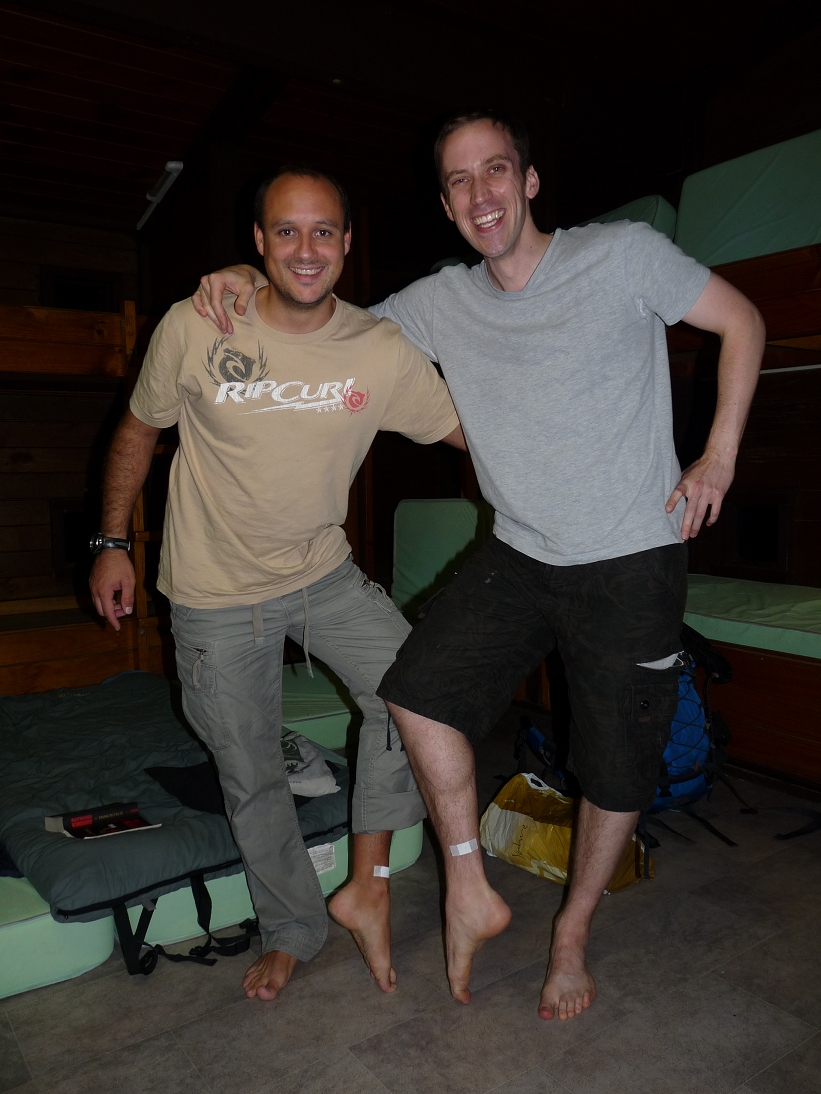Mit klatschnassen Füssen und erfolglos kamen wir wieder vor die Hütte. Hendrik stapfte zum Plumpsklo und ich wollte mir die Schuhe ausziehen, als ich 4 weitere der blutsaugenden Teufel erspähte – alle auf meiner linken Hand. Sich die Klamotten vom Leibe reißend, rief ich Hendrik zu, das gleiche zu machen und wir beide entdeckten alles in allem ca. 20-30 weitere der fiesen Würmer, von denen sich zum Glück „nur“ zwei bereits festgesaugt hatten – einer an Hendriks und einer an mein Bein. In einer erbarmungslosen Tötungsaktion wurde allen Blutegeln der Garaus gemacht, entweder Feuertod oder sie wurden von meinem Taschenmesser zerschnitten (in vier Teile, nur um ganz sicher zu gehen).